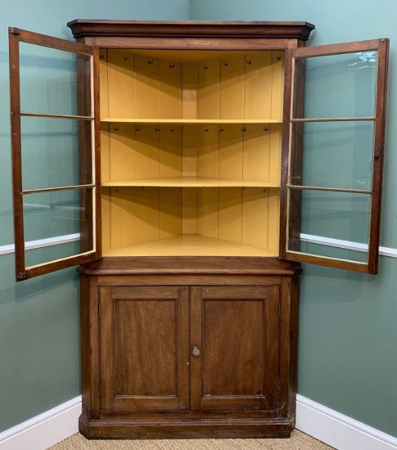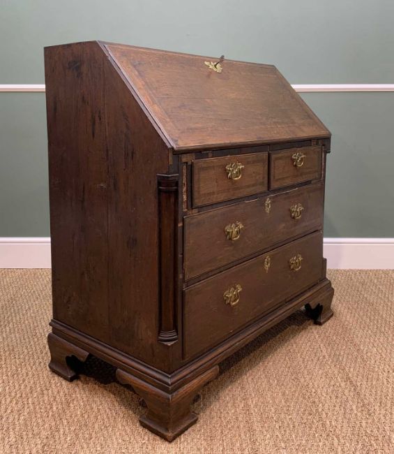 GEORGE III OAK & MAHOGANY CROSSBANDED BUREAU, angled fall enclosing fitted interior of drawers, pigeon holes with pierced brackets, cupboard, all above two short and two long drawers between a quarter pilaster angles on ogee bracket feetComments: one loper front loose, the other missing, one interior pigeon hole lacks brackets, some veneers missing to the front, others replaced, generally a little worn and tired, both long drawers with damaged mouldingsLATE 19TH CENTURY MAHOGANY STANDING CORNER CABINET, ogee cornice above astragal glazed doors and cupboard doors, between canted angles on plinth base, mustard painted interior, 197h x 110w x 55cmsComments: right side of plinth loose and with evidence of damp, otherwise generally good, clean and tidy (2)