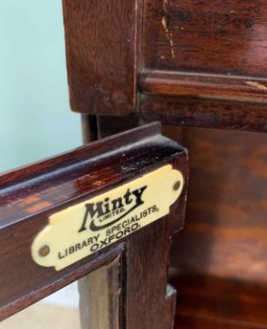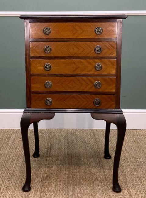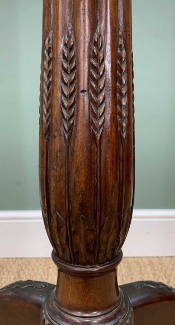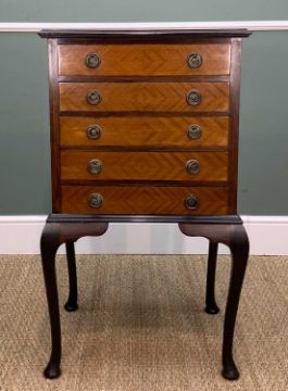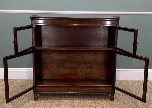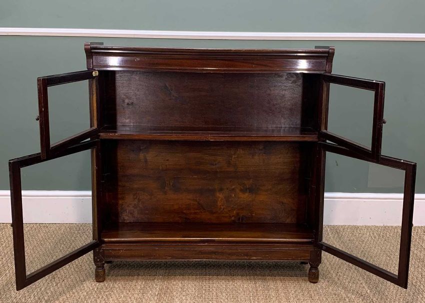 EDWARDIAN MAHOGANY MUSIC CABINET, fitted 5 drop fronted drawers, cabriole legs, 94h x 53w x 44cm d, together with Regency-style convex mirror, with reeded ebonised slip, 80cms diameter, 19th Century carved mahogany torchere, with fluted half-spherical platform above leaf capped reeded column and cabriole legs with bellflower ornament, on tripartite platform raised on bun feet, 153cms high and Minty stained beech library bookcase, of small proportions with four glazed doors, 93h x 89w x 26cms (4)Comments: mirror - re-painted, slip with worn edge, torchere - minor scuffs and scratches, cracked column, bookcase - generally scratched all over