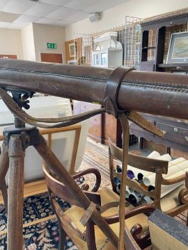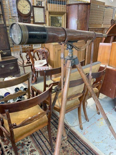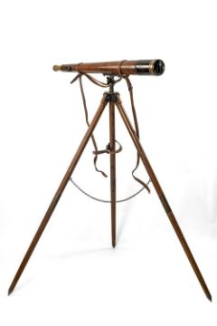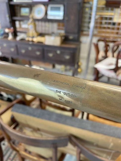 AITCHISON (LONDON) REFLECTING TELESCOPE 'THE OUTLOOK', no. 6495, in leather case on wooden tripod base, overall 121cms long x 9cms diam.