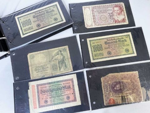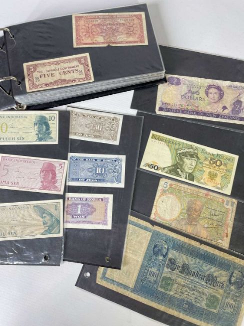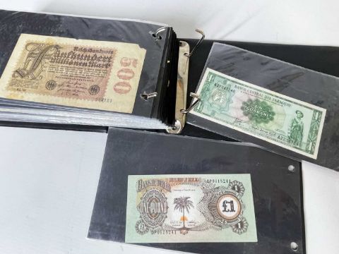 ALL WORLD COLLECTION BANK NOTES, contained within black 'Pioneer Cover' Album, including 1939 Latvian 100 Lats, numerous high denomination German Reichsmarks, Rep. of Biafra one pound, various Italian, German and French Allied Military Currency issues, Japanese Govenment rupees (Burma?) and cents, Isle of Man fifty new pence, Afrique Francaise Libre 5 francs, etc., (appr. 135)Provenance: private collection West Wales.Comments: mixed condition, from creased with tears to extremely good, inspection advised.