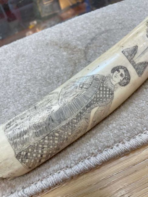 WALRUS SCRIMSHAW TUSK, 19th Century, engraved and stained with a female figure in Victorian costume, below flowering leafy shrub, apex pierced, 51cms longProvenance: private collection West WalesComments: old chip to base, age cracks.