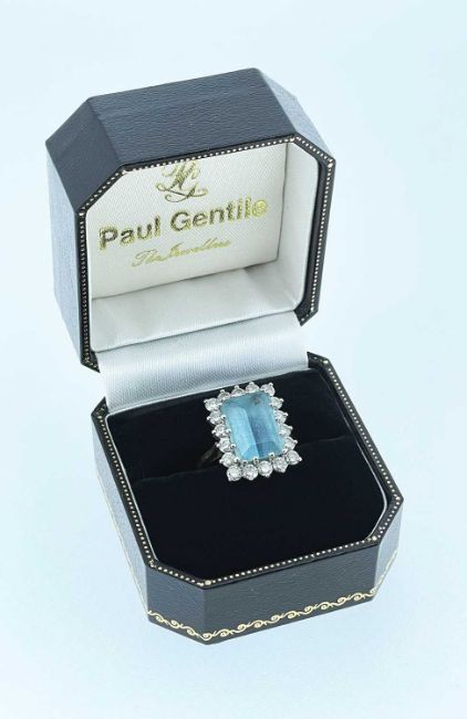 18CT GOLD AQUAMARINE & DIAMOND CLUSTER RING, claw set, the central rectangular stone (12 x 8.5mms approx.) surrounded by border of eighteen diamonds, ring size I 1/2, 5.8gms, in Paul Gentile ring boxProvenance: deceased estate Vale of GlamorganComments: all stones present, viewing recommended, all opinions are subjective and not guaranteesCondition Report:I’ve cleaned the ring and it looks like there was surface dirt underneath the stone, It looks clear nowThe colour is a little pale.The table facets have some small scratches, to the edges, consistent with wear.No apparent flaws.