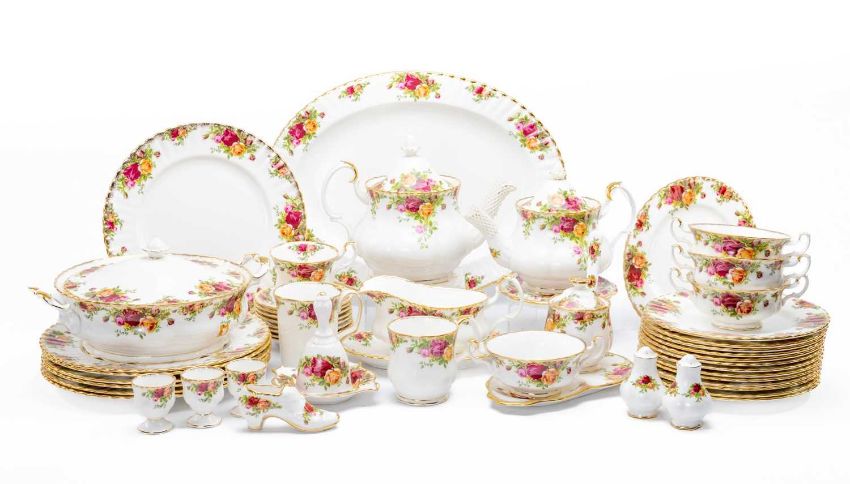 LARGE COLLECTION OF ROYAL ALBERT 'OLD COUNTRY ROSE' comprising 8 x 26.5cms dinner plates, 14 x 21cms salad/dessert plates, 22 x 16cms tea/side plates, 8 x snack/tv plates, 13 x 15.5cms soup/cereal bowls, 8 x soup cups with two handles, 8 x 13.5cms fruit saucers, 6 x round egg cups -footed, 2 x 22.5cms lidded tureens, 1 x 41cms oval platter, 1 x jam pot, lid and spoon, 1 x sauce boat and stand, 1 x 27cms cake plate, 1 x 40cm plastic tray, 1 x 17cms leaf dish, 2 x 30cm sandwich trays, 16 x teacups, 6 x 10cm mugs, 4 x 8.5cms mugs, 8 x coffee cups, 8 x 16cms saucers, 8 x 14cms saucers, 8 x 12.5cms saucers, 2 x graduated milk/cream jugs, 1 x ornamental jug, 2 x graduated sugar bowls, 1 x ornamental bowl, 3 x graduated teapots, 1 x teapot stand, 1 x salt pot, 1 x pepper pot, 1 x ashtray, 1 x ornamental bell (clapper detached), 1 x bud vase, 1 x 19cms vase, 1 x boxed cake server, 1 x ornamental basket, 1 x ornamental shoe, 1 x ornamental swan bouquet, 1 x wall clock (damaged hand), 1 x boxed thimble, 1 x boxed two-tier cake stand, 2 boxes of six melamine coasters, two boxes of six melamine table mats, two boxes of two crystal flutes, 3 x oval tableclothes (two in original sealed packaging), 2 x quilted table mats, 1 x pack of four napkins (183)Provenance: private collection West Wales. Please note: not all pieces have been photographed
