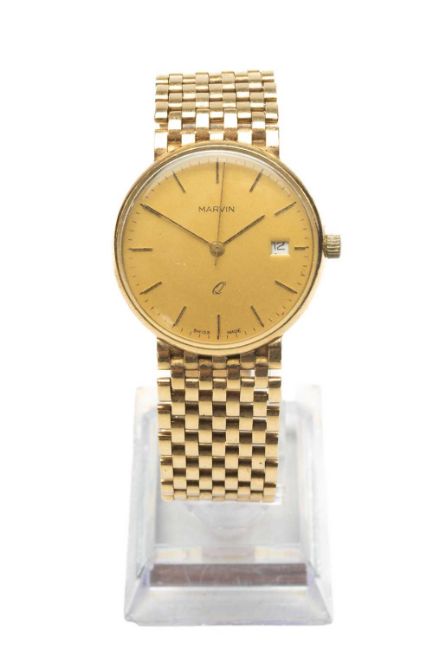 9CT GOLD MARVIN 'Q' GENT'S WRISTWATCH, the champagne dial with date aperture, baton hour markers, with integrated 9ct gold brick link bracelet, 47.8gmsProvenance: deceased estate CarmarthenshireComments: not curerntly ticking, surface wear and scratches, needs good clean, clasp working