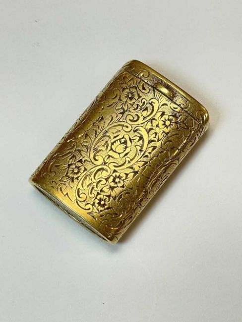 14K GOLD VESTA CASE, overall scroll engraved, of rectangular curved shape with striking end, hallmarked '585' and 'FM', 13.0gmsProvenance: private collection Pembrokeshire
