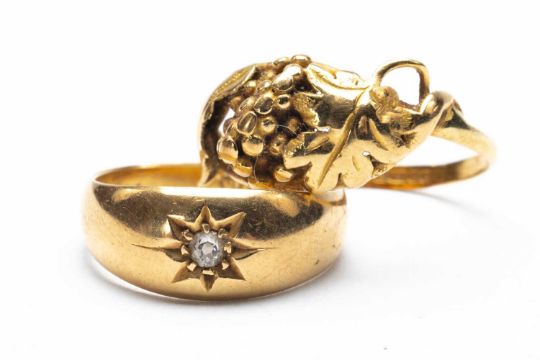 TWO 18CT GOLD RINGS comprising leaf and berry design ring, together with diamond 'gypsy' set ring, 7.7gms gross, in Manning & Son of Penarth ring box (2)Provenance: private collection Swansea