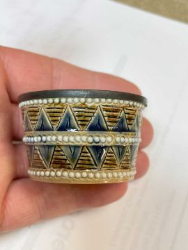 COLLECTIBLE POTTERY, comprising two 18th Century Delft tiles, painted in aubergine and in blue with figures, 13cms wide (one repaired), and Doulton Lambeth three-piece stoneware cruet, dated 1877, with electroplated mountsProvenance: private collection Glamorgan