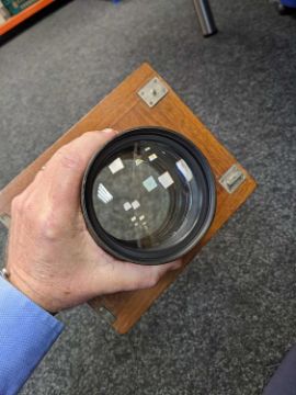 Comments: frosted glass plate cracked, folding base damaged (missing strut), hinges cracked, some screws missing, metal fastenting strut bent, metal fastening clasp missing, lens mould to margins, inspection advised.