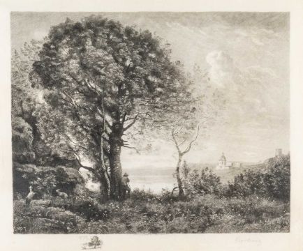 FRITZ KROSTEWITZ AFTER JEAN-BAPTISTE-CAMILLE COROT two drypoint etchings - peasant under tree regarding distant church, 41 x 51cms, together with river fisherman with stone bridge to background, 41 x 51cms, both inscribed 'Published and copyrighted by J. Casper, Berlin 1901', both signed in pencilProvenance: private collection north Cardiff