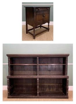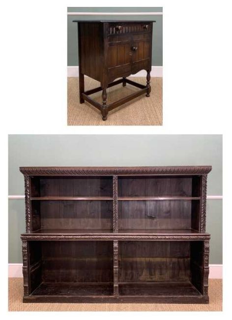RENNAISANCE STYLE OAK BOOKCASE, carved and stained, two tiers, 124.5h x 176w x 38cms d; together with similar Priory-style oak cupboard, 88h x 76w x 46cms d (2)Provenance: Pembrokeshire Country HouseComments: generally worn, lower 2 shelves loose.