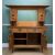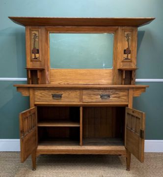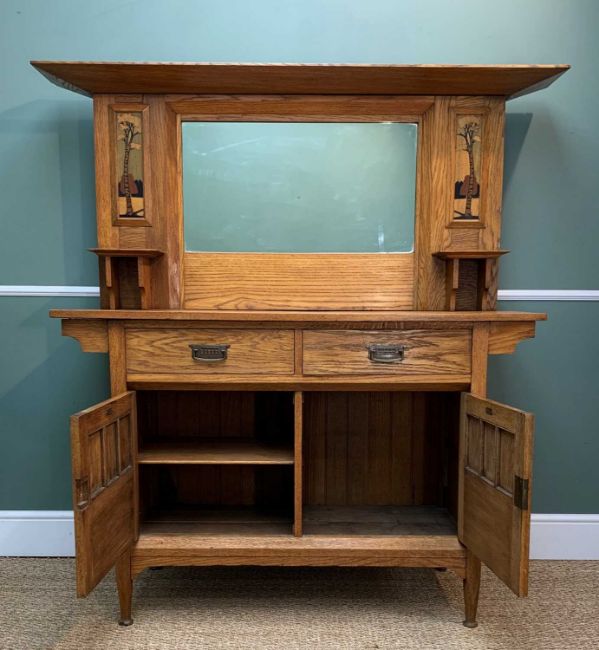 LIBERTY-STYLE ARTS & CRAFTS OAK MIRROR BACK SIDEBOARD, angled cornice above mirror set back between marquetry panels and shelves, above chest and cupboard base, raised on tapering circular legs with pad feet, both drawers stamped reg. no. 444344, 159 h x 164 w x 57cms dComments: pad feet damaged, marquetry veneer slightly lifting, handle plate missing from cupboards, circ. watermarks to shelves, cornice slightly loose