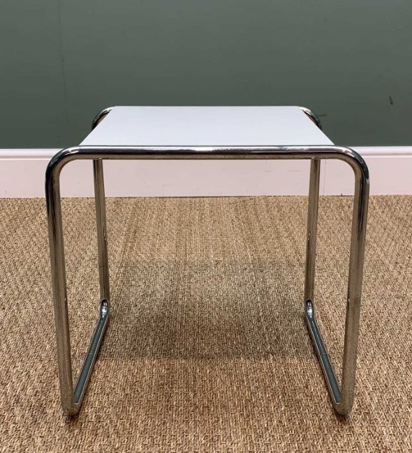 MARCEL BREUER FOR THONET, pair B9 chrome and white occasional tables, label, 53w x 50h x 39cms d (larger) (2)Comments: table tops very lightly scratched, chrome frames excellent