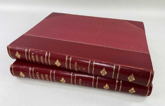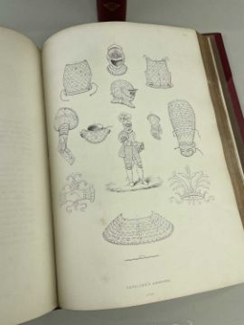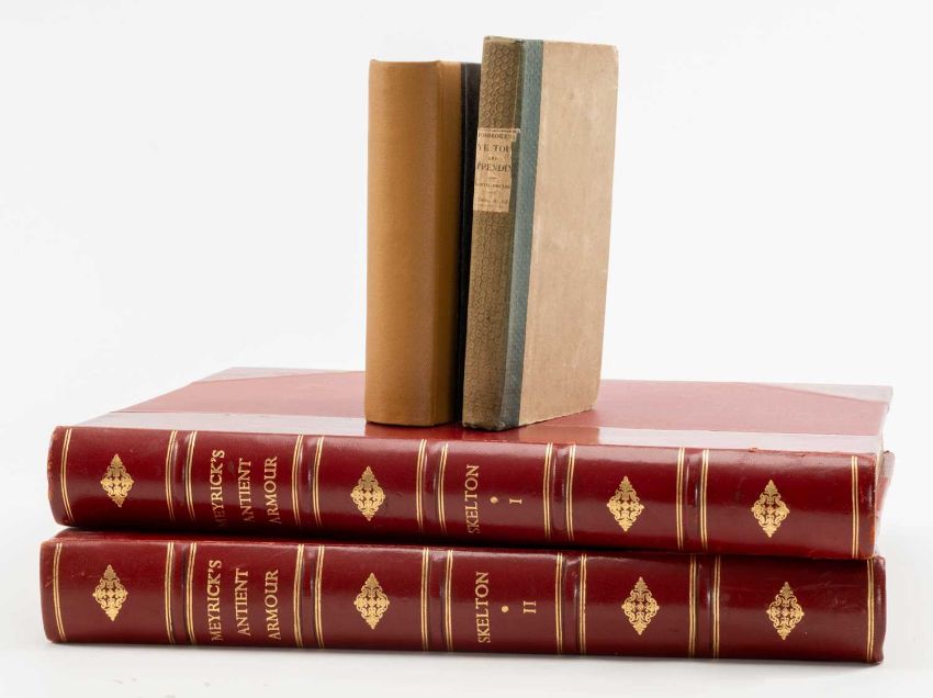 MEYRICK (SAMUEL RUSH) & SKELTON (JOSEPH) engraved illustrations of Ancient Arms and Armour from the collection at Goodrich Court, London: Henry G. Bohn, 1854, 2 volumes, engraved frontispiece to each vol., portrait and 150 plates, half morocco, spines in compartments, a.e.g., folio, slightly rubbed at extremities, occasional spotting or foxing, generally very good all around; together with FOSBROKE (T.D.) The Wye Tour or Gilpin on 'The Wye', with Goodrich Court Appendix, FIFTH EDITION, 1838, hinge split, minor foxing, spine label damaged, 8vo; and SMITH (LT. COL. CHARLES HAMILTON) The Natural History of the Human Species, Supplementary Vol 1, with 34 plates, some hand coloured, Chatto & Windus, 1875, rebound, repairs, replaced endpapers (4)Provenance: private collection Herefordshire
