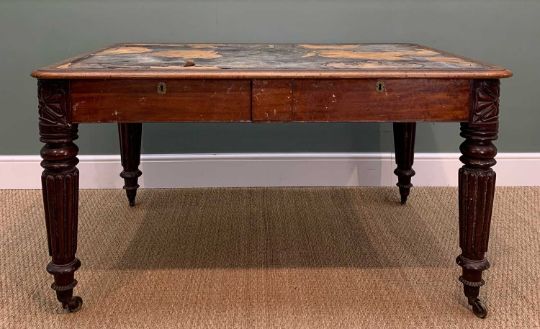 GEORGE IV MAHOGANY LIBRARY TABLE, in the manner of Gillows, moulded crossbanded with inset leather, above two pairs of opposing flush frieze drawers, raised on lobed tapering legs headed by carved foliate capitals, foliate brass caps and castors, 75h x 140w x 103cms dProvenance: Pembrokeshire Country HouseComments: leather a/f, generally worn, inspection advised.