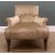 HOWARD & SONS EASY ARMCHAIR, button upholstered scroll back and arms, deep tapering seat, turned legs with brass cappings and castors stamped 'Howard & Sons London', 74h x 72w x 77cms d