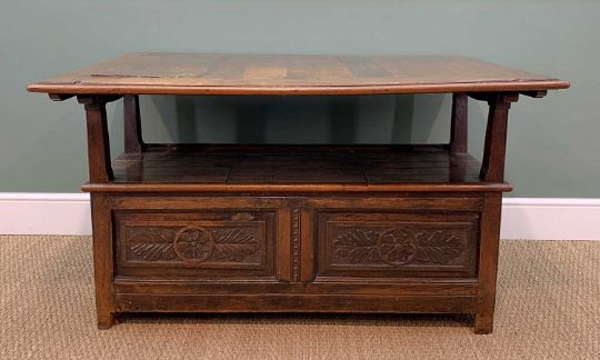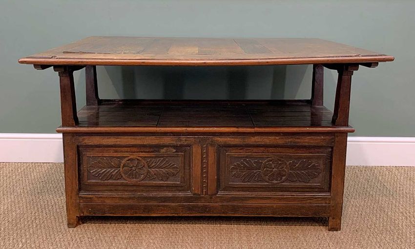 JOINED OAK TABLE SETTLE, folding top decorated to the underside with three panels of geometric carving, opening to form the settle back, slatted seat with hinged lid, further carvings to the lower panels, 135h x 125w x 55cms dProvenance: Pembrokeshire Country HouseComments: generally good