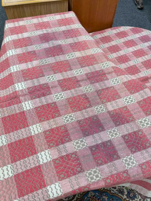 ANTIQUE WELSH WOOLLEN NARROW LOOM BLANKET, 3-colour cherry, cream and taupe heavy weight yarns, woven in broad check with geometric diamond meander, blanket stitched edge, 178 x 208cmsProvenance: private collection LondonComments: faded as expected, some stitching opening