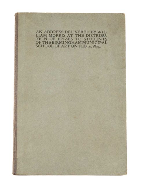 MORRIS (WILLIAM), 'An Address Delivered by William Morris...Prizes to Students...Birmingham Municipal School of Art.... Feb. 21 1894', quarter cloth binding over paper boards, 8vo, London, Chiswick Press, 1898, with insert from the Chiswick Press explaining their ownership of the type the address was printed in.Provenance: private collection GlamorganComments: staining to end pages, foxing to insert, minor foxing to page edges