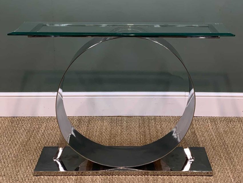 CONTEMPORARY STAINLESS STEEL & GLASS CONSOLE TABLE, circular mid-section with bevelled glass top, 106.5w x 75h x 30.5cms dProvenance: Private collection West Wales, consigned via our Cardiff office
