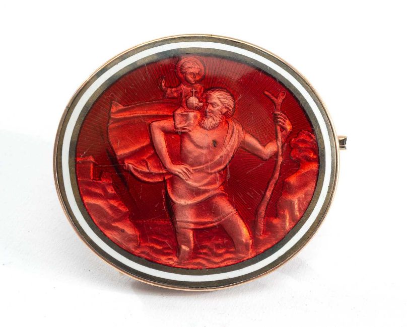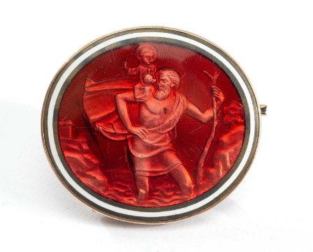 YELLOW METAL & RED GUILLOCHE ENAMEL BAR BROOCH, of oval form depicting religious scene, possibly Moses, unmarked, 39.8gmsProvenance: deceased estate CarmarthenshireComments: some cracks and damage to enamel