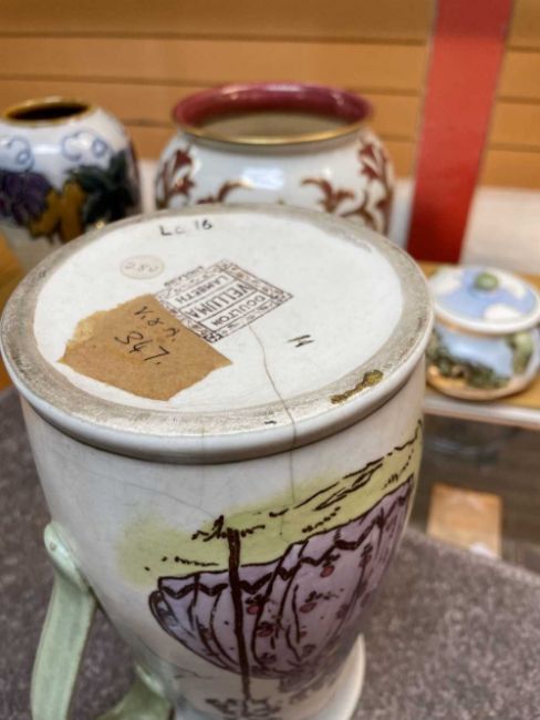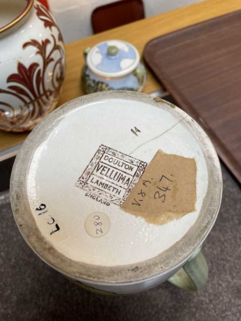 ASSORTED DOULTON CERAMICS comprising two Doulton Burslem Art Ware vases, two items of Doulton Burslem Morrisian ware, pair of Doulton Lambeth Dutch design vases, pair of Royal Doulton Lambeth berry vase, four pieces of Doulton Lambeth Velluma ware (12)Provenance: collection of the late Dr Ronald Austin of SwanseaComments: viewing recommended Condition Report:Hairline cracks and restoration to the lidded ‘Velluma’ bowl also two of the ‘Velluma’ jugs have cracks.