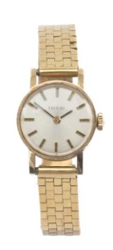 18CT GOLD TISSOT LADIES BRACELET WATCH, champagne dial with baton numerals, brick link bracelet with deployant clasp engraved with initials, clasp stamped 750, 20mm diam.Comments: a few links dented. Condition Report:Total weight is 23grams