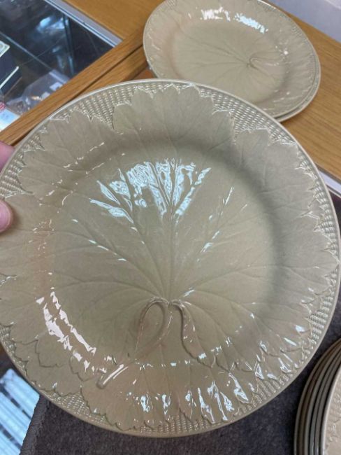 ASSORTED PART DINNER SERVICES, including 9 Minton 'Infanta' soup coupes and 10 stands; 6 'Persiana' plates and 2 meat platters; Hicks and Meigh pattern 53 'Stone China' - 3 meat platters, 1 dinner plate, 2 salad plates, glass clam dish; 11 Wedgwood leaf moulded plates; Coalport 'Aster' pattern jug; Davenport ivy pattern plate, ETC.Provenance: Pembrokeshire Country House.Comments: NB. The 'Valencia' pattern dinnerwares and the 'Chelsea' pattern dinnerwares are NOT part of this lot as previously stated. Viewing advised, damage to some Condition Report:There are eleven Wedgewood leaf plates in total only two of them are damage free, all others have rim chips and cracks.There are eight ribbon plates, four look good, four have rim chips.