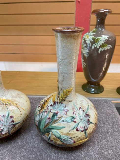 FIVE DOULTON IMPASTO VASES, comprising pair bottle vases painted with wildflowers and barley, 1879, one labelled 'Richard Dennis Doulton Pottery Exh. 1975, no. 211, 22cms h, pair baluster vases painted with daisies, 1885, 24.5cms h, and a pear shaped vase painted with narcissus, 22cms h, all with impressed marks and incised numerals (5)Provenance: collection of the late Dr Ronald Austin of SwanseaComments: narcissus vase restored