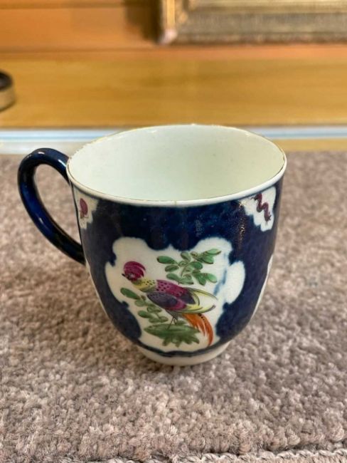 18TH CENTURY WORCESTER PORCELAIN SCALE-BLUE GROUND TRIO, c. 1770, shaped reserves enamelled with exotic birds and insects, comprising teacup, coffee cup and saucer, square seal marks (3)Provenance: private collection South Wales.Comments: all gilt rims worn and reserves ungilded, coffee cup tiny rim crack,
