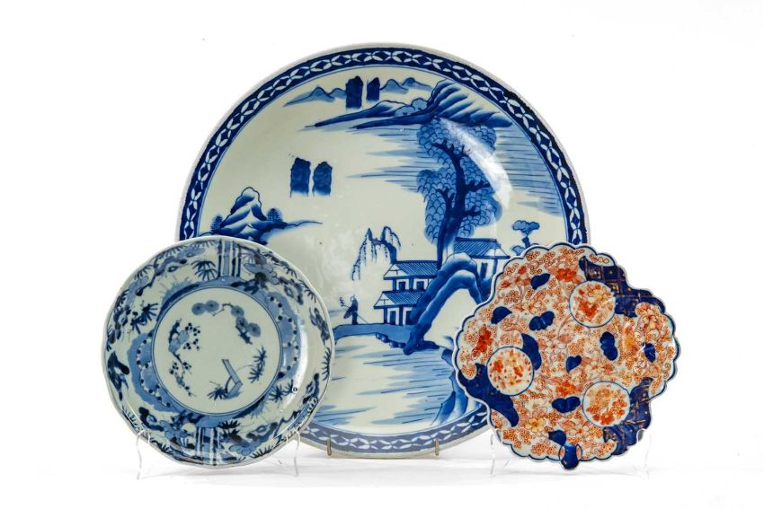 THREE JAPANESE PORCELAIN DISHES, comprising Arita blue and white Sho Chiku Bai dish, Edo period, centre painted with sprigs of plum, bamboo and pine, within foliate border, running fuku mark, 21cms diam, Arita blue and white charger, Taisho period, painted with Chinese style river landscape, 39.5cms diam.; and Imari leaf-shaped dish, Meiji period, 21cms diam. (3)Provenance: private collection north Wales