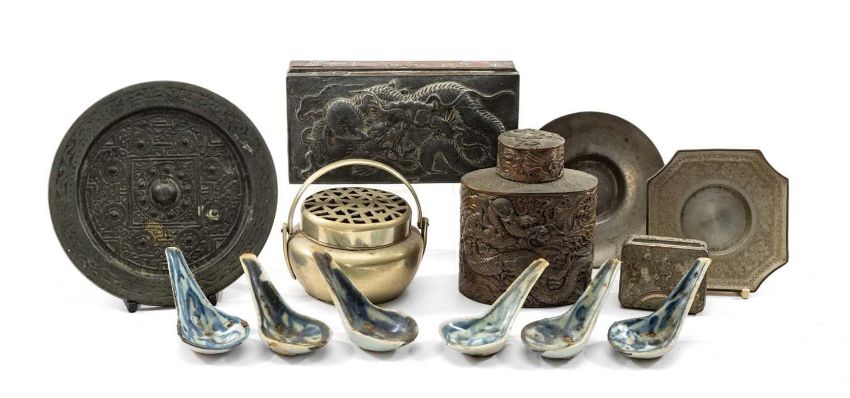 ASSORTED ASIAN METALWARE, including Chinese portable hand warmer, archaistic bronze mirror, tea canister, tea box ETC., together with six provincial blue and white soup spoonsProvenance: private collection Cardiff