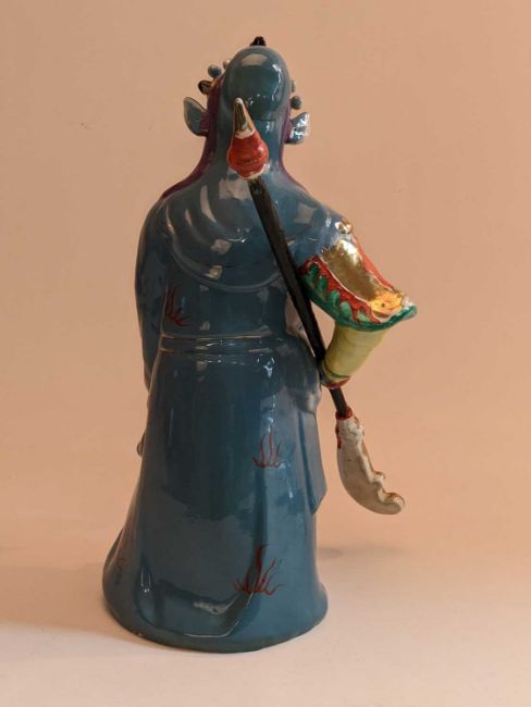 CHINESE PORCELAIN FIGURE OF GUAN YU, late 20th Century, the late Han Dynasty general dressed in flowing robes and holding a bladed weapon, decorated in bright enamels and gilt highlights, 46cms hProvenance: private collection CardiffComments: minor enamel losses, wood shaft to weapon.