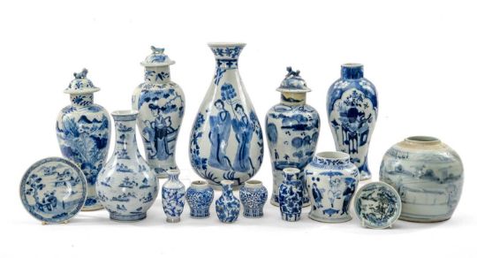 ASSORTED CHINESE BLUE & WHITE PORCELAIN, 19th/20th Century, including Kangxi-style pear shaped vase painted with ladies, provincial storage jar, small baluster jar, four baluster vases, three covers, miniature vases etc.Provenance: collection of the Late Dai Evans, former Director of Picton Castle and former curator of Petworth HouseComments: three baluster vases damaged, various cracks, damage, repairs, see additional images, but inspection advised.