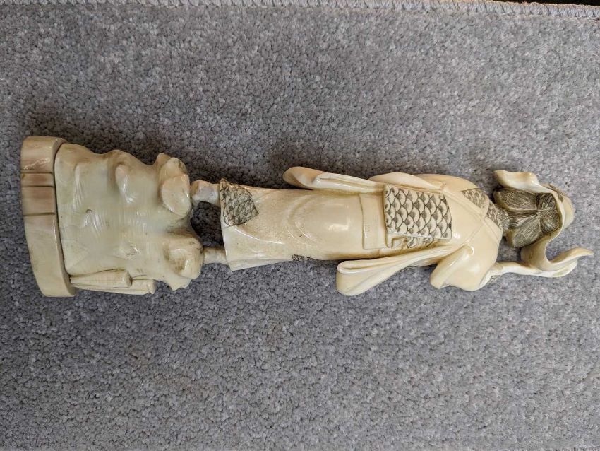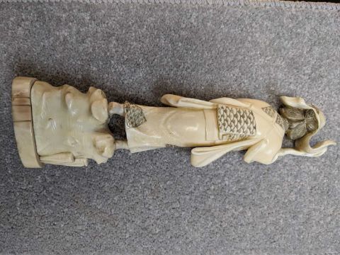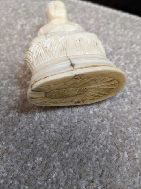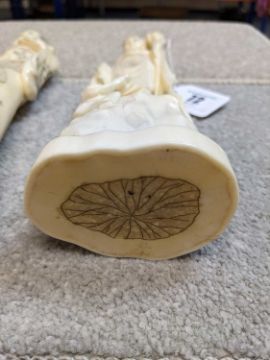 FOUR JAPANESE MARINE IVORY OKIMONO, Meiji Period, comprising Kwannon, female farmer, sage, all about 23cms h; and a small Amida Buddha, 9cms h (4)Provenance: private collection south Wales.Comments: bases loose, others with old reglued bases, basket handle cracked, Buddha back with small cracks, see additional images