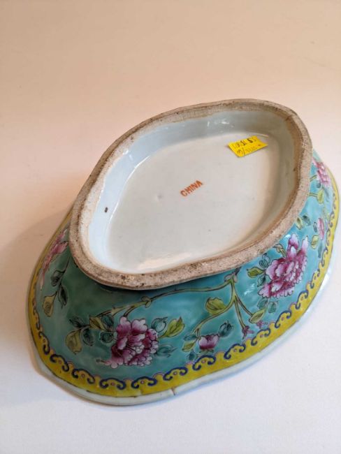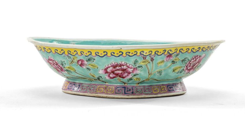 CHINESE FAMILLE ROSE OFFERING DISH, 20th Century, of shaped lozenge form, outside painted with peony between yellow ruyi head band and pink keyfret spreading foot, 8h x 30.5w x 21cm dProvenance: private collection South WalesComments: two firing faults to rim