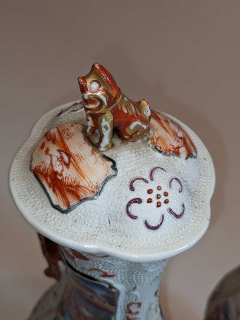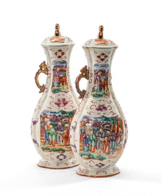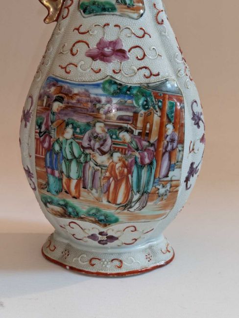 PAIR CHINESE FAMILLE ROSE BALUSTER VASES & COVERS, Qianlong, of quatrefoil section, decorated in the Mandarin palette with shaped, raised panels of figures on terraces, reserved on a 'chicken-skin' ground with lotus flowers and tendrils, gilt dragon handles, covers with dog-of-fo knops, 33cm high (2)Provenance: private collection West Wales.Comments: both vases with damaged and deficient handles, one with chip and crack to rim, one cover with restuck knop, see additional images.