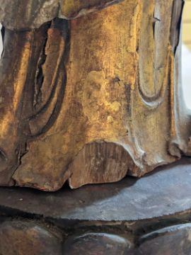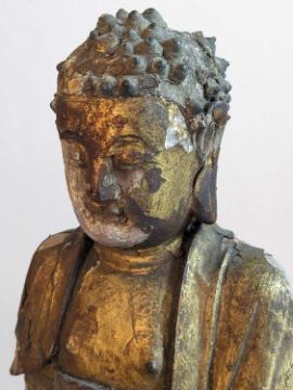 JAPANESE GILT WOOD FIGURE OF AMIDA NYORAI, probably late Edo Period, standing on separate double lotus base, his curled hair with central ushnisha, wearing flowing robes, vacant prayer compartment to rear, 50cms hProvenance: private collection CardiffComments: lacquer badly flaking, one hand deficient the other broken, one foot broken, some hair curls missing