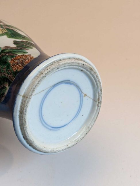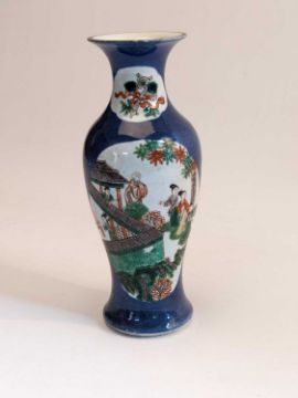 CHINESE FAMILLE VERTE VASE, Late Qing Dynasty or later, painted with shaped panels depicting courtesans, monks and scholars in landscapes, reserved on a powder blue ground, base with underglaze blue double circle, 25cm hComments: rim slightly ground, cracked base