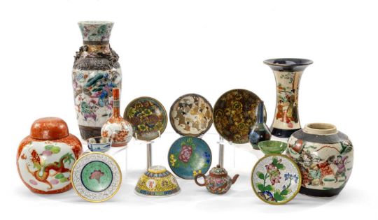 ASSORTED CHINESE & JAPANESE ORNAMENTS, including Satsuma bowl & vase, Chinese crackleware vase, small cloisonne dishes, spinach green hardstone wine cup, etc. (16)Provenance: private collection South Wales.Comments: some minor damage, inspection advised