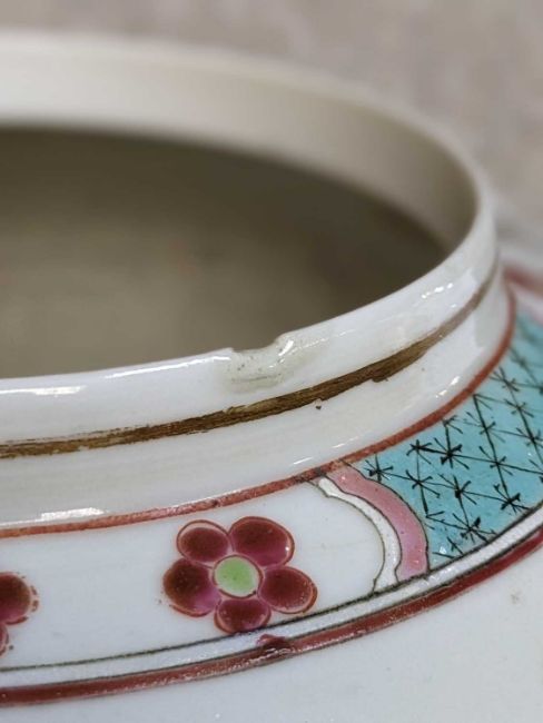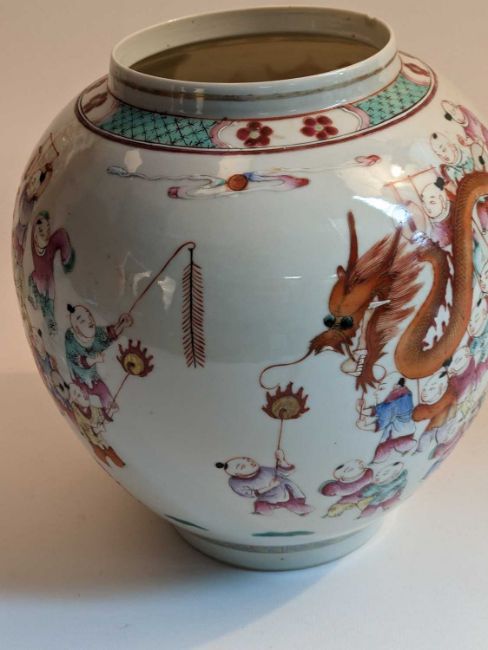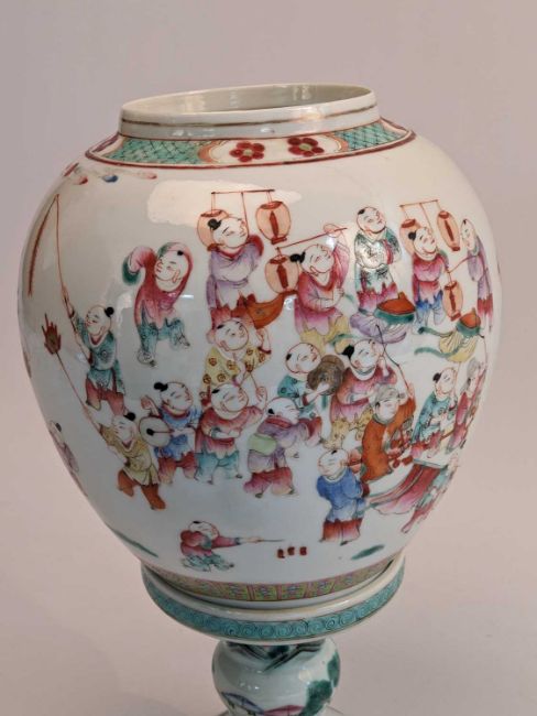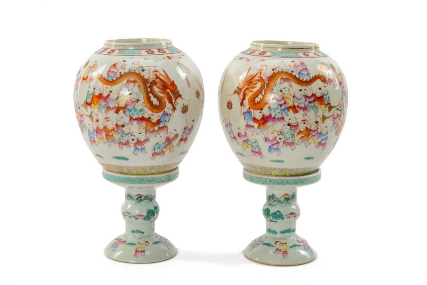PAIR CHINESE FAMILLE ROSE 'HUNDRED BOYS' LANTERNS & STANDS, late 19th Century/Republic, painted with a festival procession of boys with lanterns, firecrackers and dragon dance, between diaper and lappet borders, on knopped column stands with domed feet, 31cms h (4)Provenance: private collection Cardiff.Comments: one with chipped/fire fault to foot, other similar issues with rim.