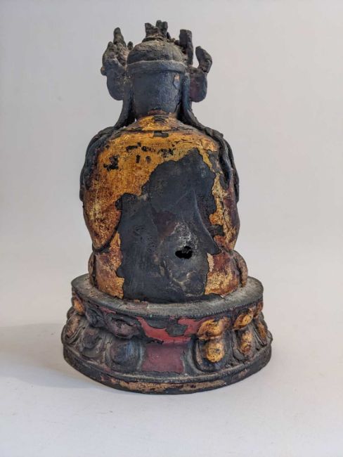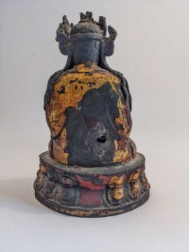 CHINESE LACQUERED BRONZE FIGURE OF GUANYIN, late Ming Dynasty, the serene bodhisattva seated in dhyanasana on double lotus dias and wearing crown, necklaces, the right hand probably formerly holding a cup, heft hand raised before the chest, possibly vitarkamudra, 25cms h.Provenance: private collection Cardiff.Comments: headdress and left hand damaged, holes to knee and back, base edge partially damaged, lacquer flaking/worn, see additional images, inspection advised.