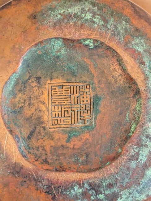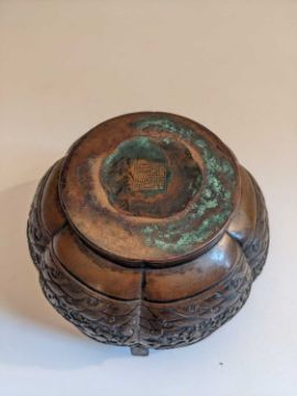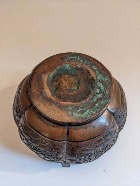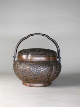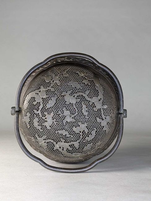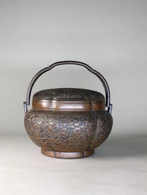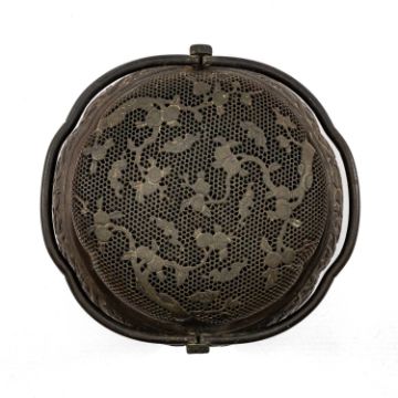 MING CHINESE 'BATS & PEACHES' PATINATED COPPER HAND-WARMER, 17th Century, of six-lobed form, the sides engraved with continuous frieze of fruiting peach branches and ornamental rocks above crashing waves, the similarly shaped cover pierced and decorated with five bats flying amongst three fruiting peach tree branches, twin slender bamboo-form swing handles, base with 4-character seal mark 'Pan Xiang Feng Zhi', 15cms diam x 16.5cms high (incl handles)Provenance: private collection North Wales.Auctioneer's Note: As Tse Bartholomew explains, in Chinese 'five bats' (ch: wu fu) is homophonous for 'five blessings', traditionally: longevity, wealth, health, love of virtue, and a peaceful death. The decoration is particularly auspicious, as bats with peaches present the wish for blessings and longevity. Pan Xiang Feng was a Master in the making of miniature stoves including hand-warmers, feet-warmers and sleeve-warmers, working from the late Ming to the early Qing period. Such vessels were used primarily to keep the hands warm during the long cold winters and the small size, would have made this example easy to handle and even tuck inside voluminous sleeves. Cf. An essay by Ulrich Hausmann entitled 'Keeping Warm in a Cold Study: The Warmer' published by Paul Moss (ed.) in his exhibition catalogue The Literati Mode: Chinese Scholar Paintings, Calligraphy and Desk Objects, Sydney L. Moss, London, 1986, pp. 311-315.Comments: excellent condition, surface of cover patina dull from dusting over the years, base with wear as usual.