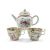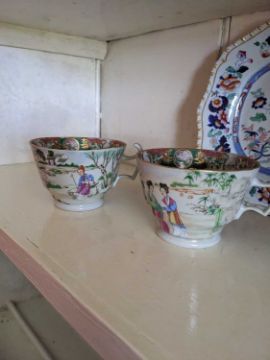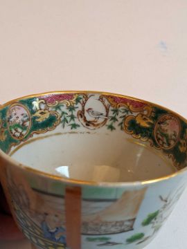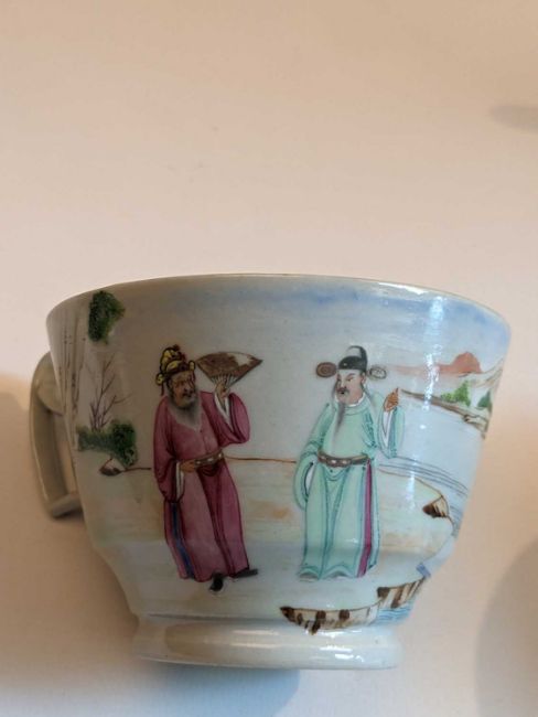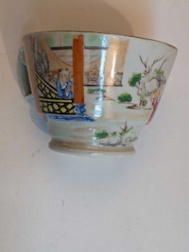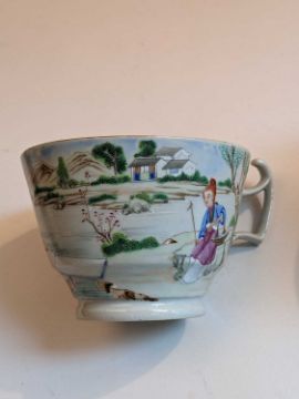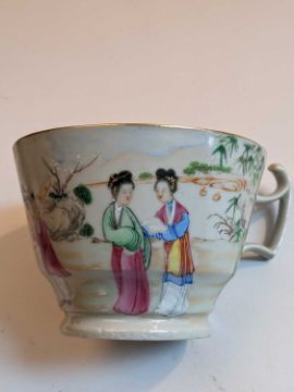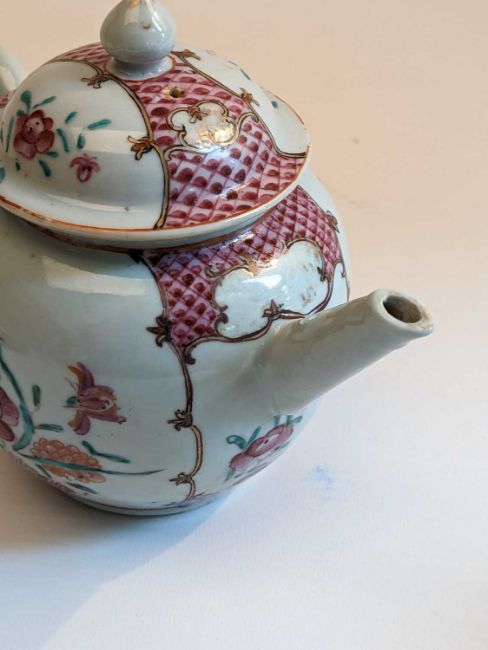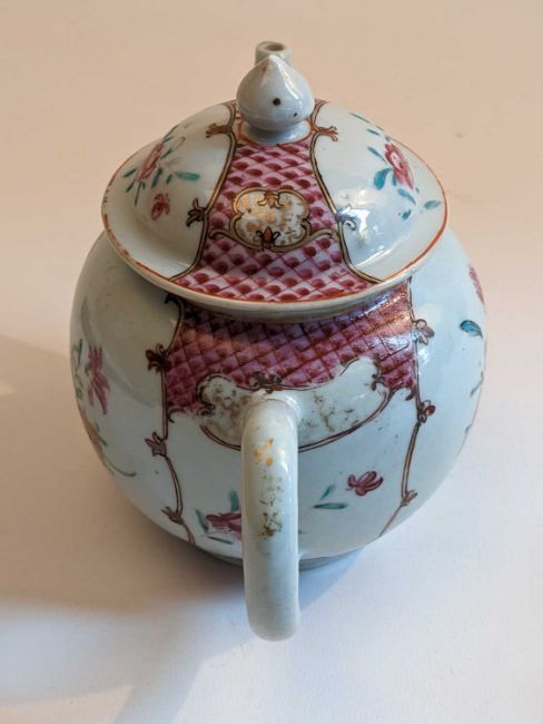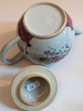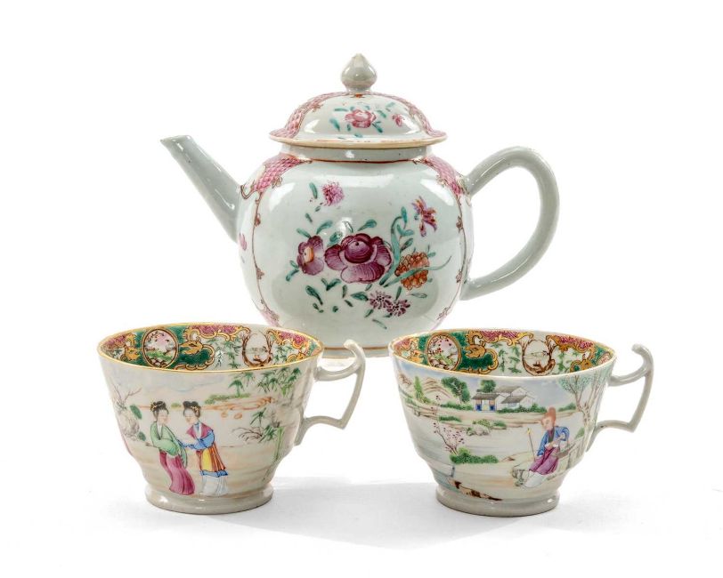 CHINESE FAMILLE ROSE TEAPOT & TEA CUPS, 18th/19th Century, the teapot and cover enamelled with flowers 13.5cms h, the pair London-shaped teacups enamelled with Manchu figures in a garden, elaborate inner decorated rims, 6.5cms h (3)Provenance: Pembrokeshire Country HouseComments: chip to knop of cover, chips to footrim of teapot, no saucers.