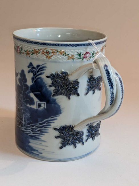 LARGE CHINESE EXPORT BLUE & WHITE TANKARD, Qianlong, painted with a river landscape with pavilions, the basketweave moulded rim gilt and enamelled with flower garland and with cartouche with initial 'J', crossover strap handle, 15.5cms hProvenance: private collection South Wales.Comments: minor rim chips.