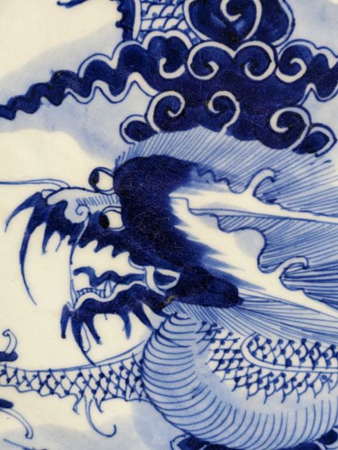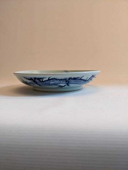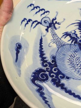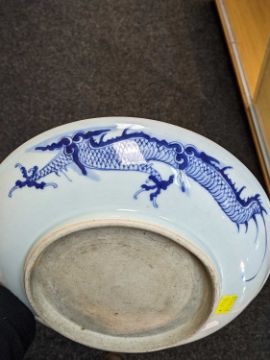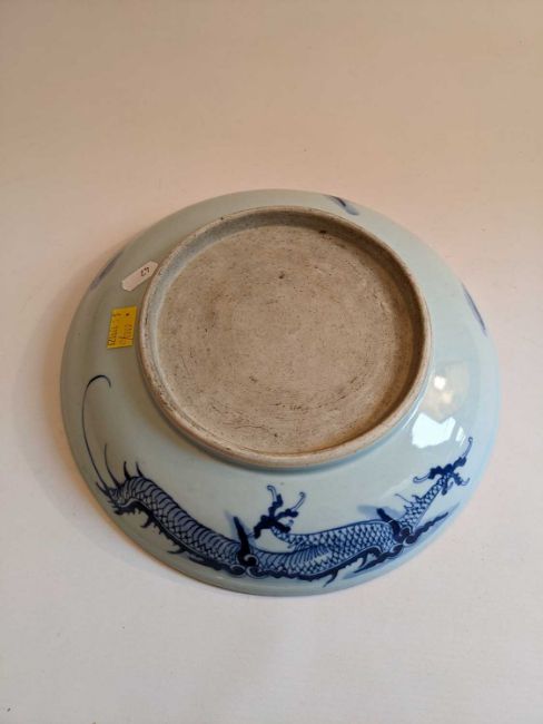 CHINESE BLUE & WHITE 'DRAGON' SAUCER DISH, late Qing dynasty, painted with a large 4-clawed dragon chasing a pearl, the decoration continuing from the underside, unglazed base, 28.5cms diam.Provenance: private collection north Wales. Comments: good overall condition.