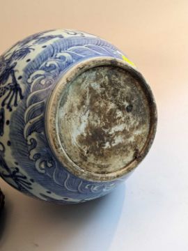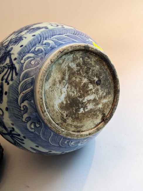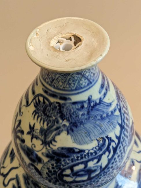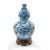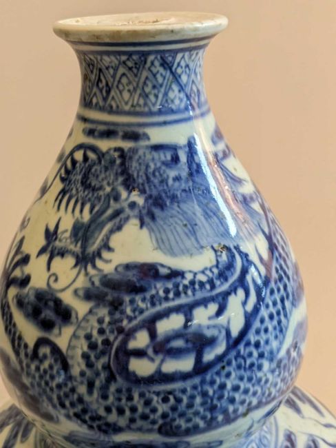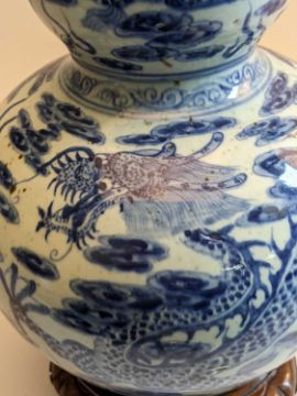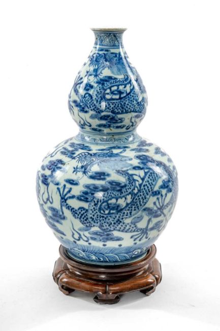 CHINESE BLUE & WHITE DOUBLE GOURD VASE, 20th Century, painted in the Ming dynasty-style with three 5-clawed dragons amid clouds and above waves, between diaper borders, 42.5cms h, associated wood standProvenance: collection of the Late Dai Evans, former Director of Picton Castle and former curator of Petworth HouseComments: unglazed base, neck filled to accommodate light fitting, not damaged or drilled, stand cracked