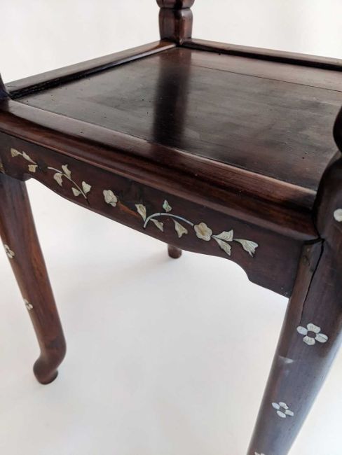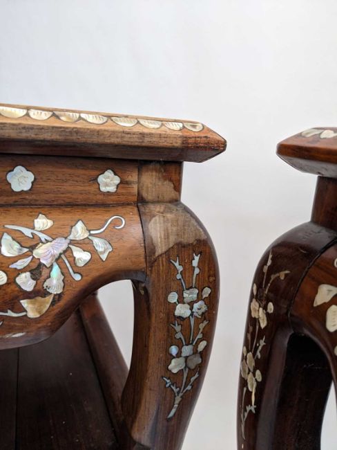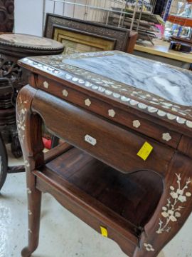 PAIR CHINESE HARDWOOD & MOTHER OF PEARL INLAID STANDS, square tops inset with veined grey marble panels, frames profusely inlaid with flowers, friezes pierced, legs joined by under tiers, 79h x 41w x 41cms d (2)Provenance: collected c. 1920s in Malaysia, thence by descent private collection South Wales.Comments: joints loose, one undertier replaced, other elements replaced, splits and minor losses, inspection advised