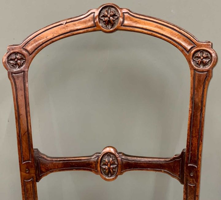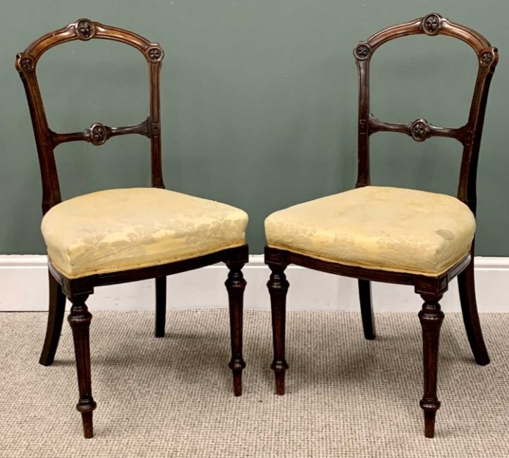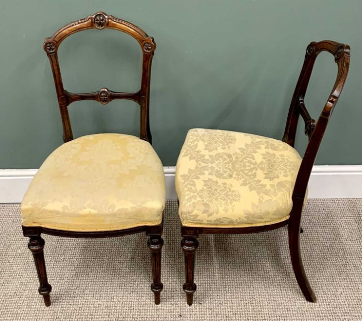 A PAIR OF ANTIQUE WALNUT PARLOUR CHAIRS with carved leaf detail and leaf pattern gold upholstery on turned supports, 90cms H, 45cms W, 45cms D
