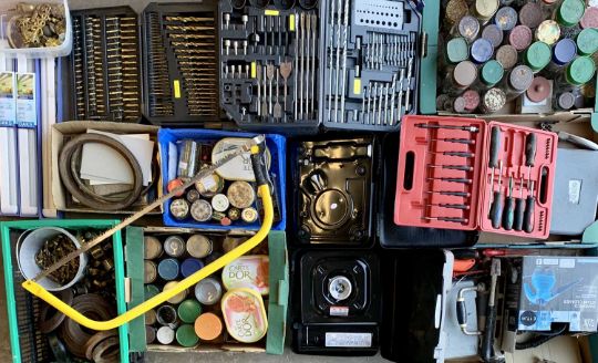 GARAGE CONTENTS to include a comprehensive set of cased drill bits, fixings, ETC