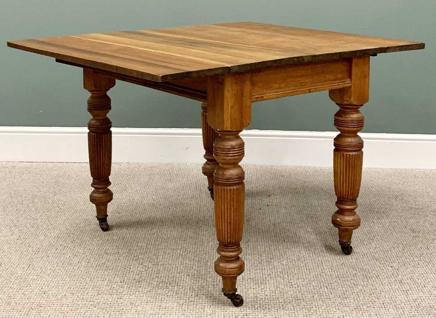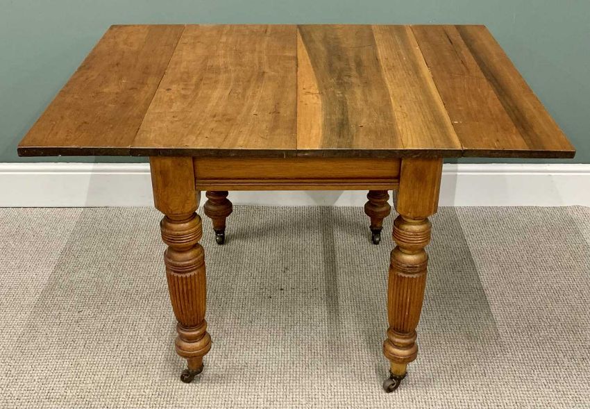 EDWARDIAN OAK TWIN FLAP TABLE on turned and reeded supports with metal castors, 73cms H, 114cms w (open), 92cms L